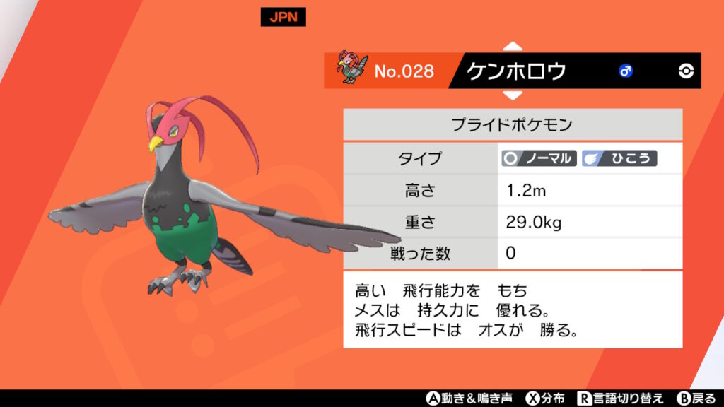 だいぶ探してそういえばワイルドエリアの入り口を飛んでいたことを思い出し、早速捕獲しにいきましが、残念ながらオスでした(^-^)